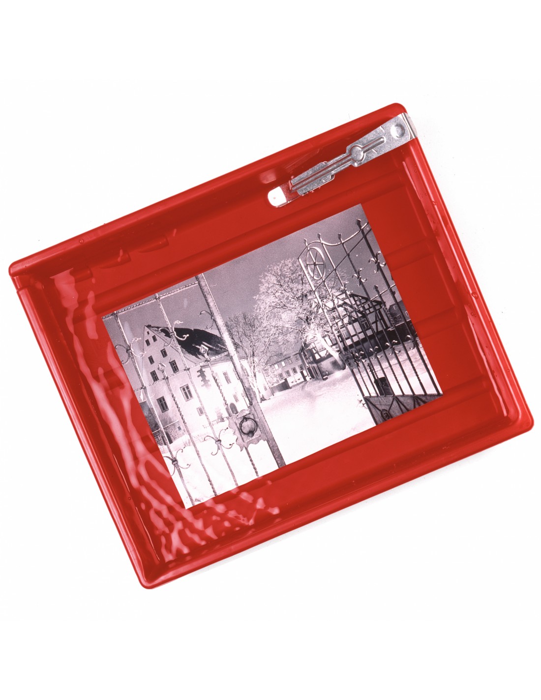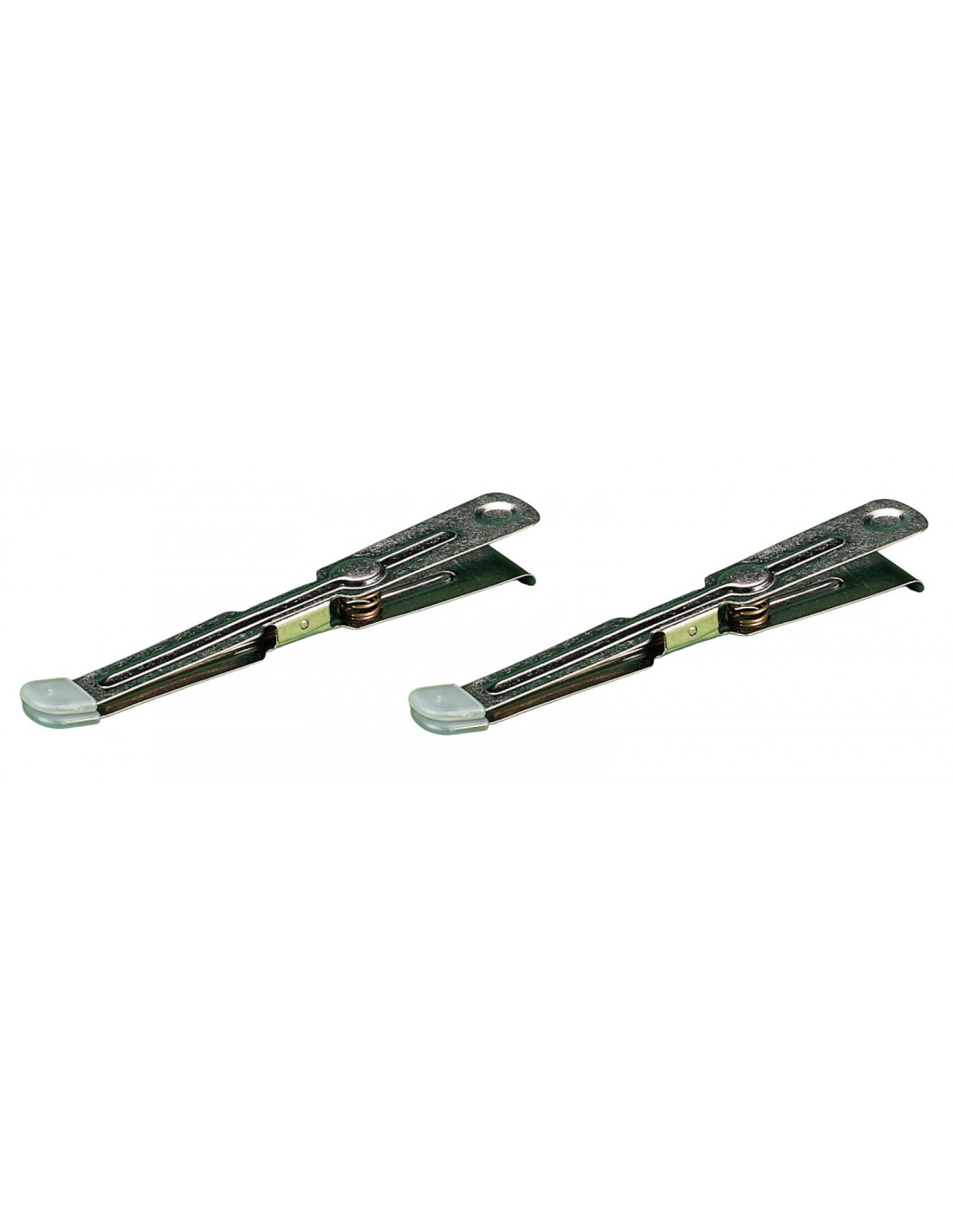 Pinze in acciaio inossidabile, resistenti ai prodotti fotochimici. Con molla a spirale e gancio per appendere sul lato del vassoio. Con cappuccio di protezione appositamente studiati per la lavorazione di carte plastificate.