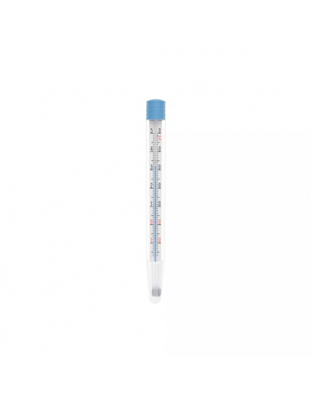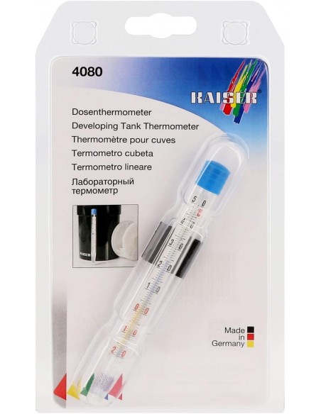 Termometro calibrato ad alcool. Stelo in plastica infrangibile. Con scale centigradi: da -10 a 50° C, scala di misurazione 1 grado centigrado, indicato per tutti i tipi di processo di sviluppo
