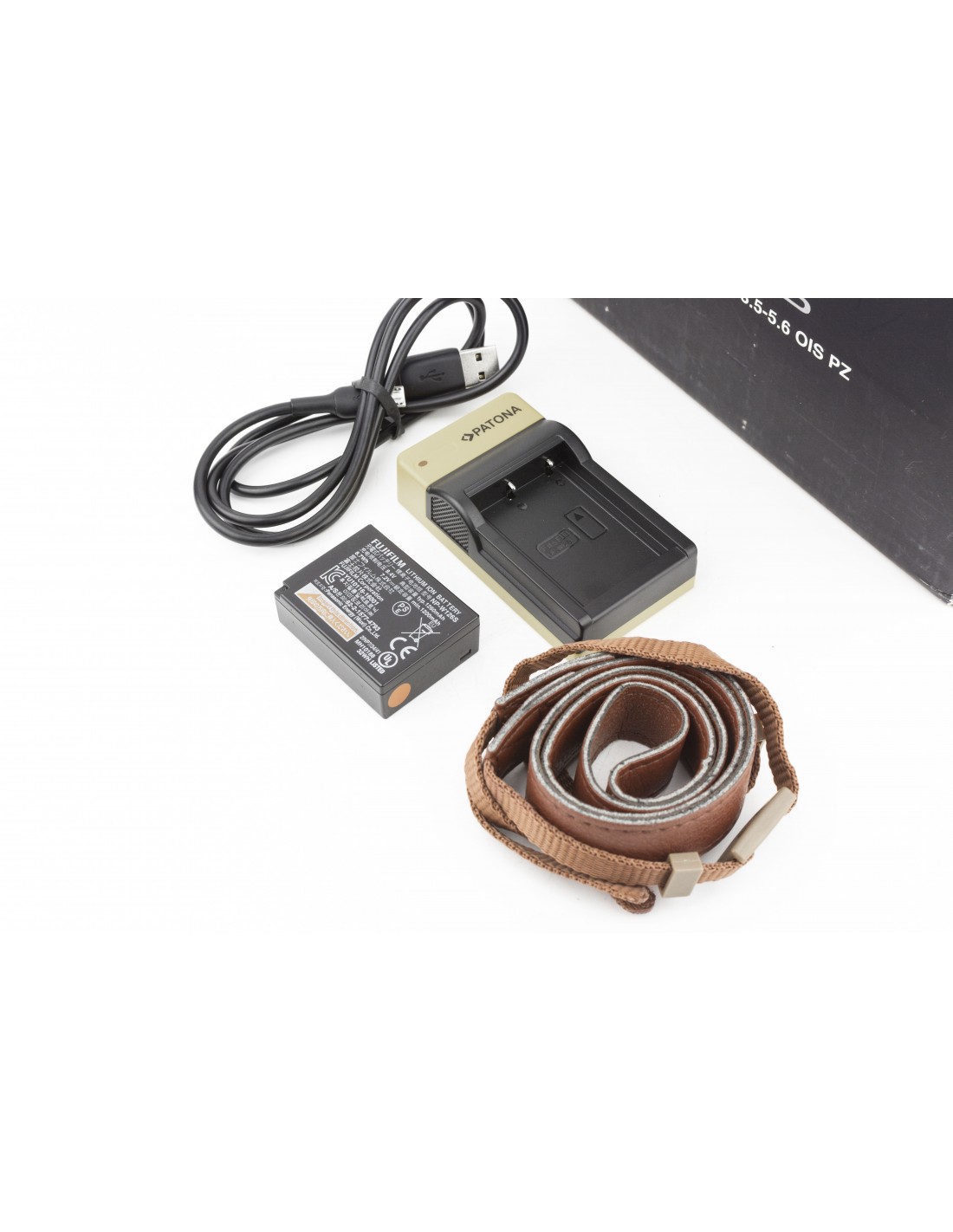 batteria originale, caricabatterie Patona, cinghia Fujifilm marrone, tappo corpo